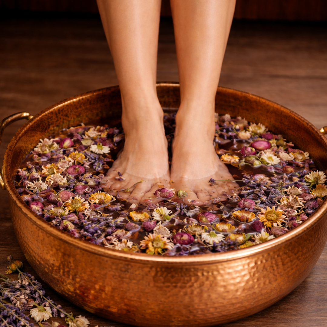 This foot bath uses a blend of herbs, dead sea salt, magnesium flakes, sodium bicarbonate, bentonite clay, and essential oils to provide clients a relaxing add-on option to their services.